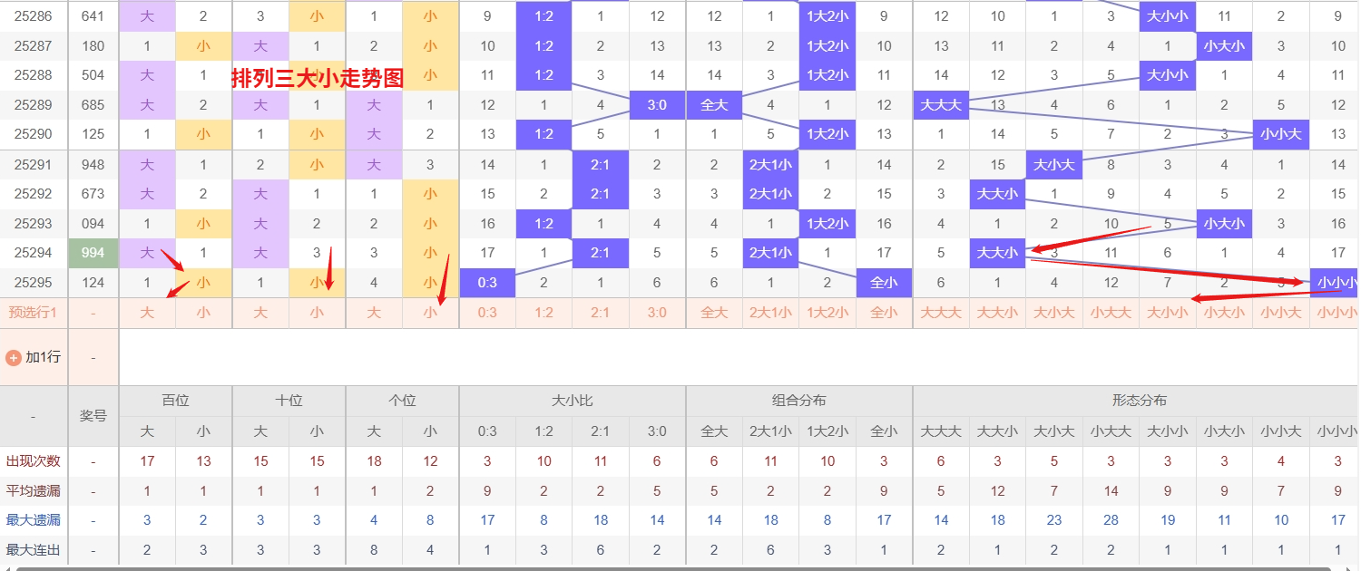 排列三 大小形态分析:从大小走势图上可以看出排列三100期内百位大小比约为53比47,十位大小比约为46:54,个位大小比约为52比48,除了个位和百位奇数比偶数多,十位是偶数比奇数多。历史数据近2期开出小小小下一期的走势为,第217期开出小小小第218期开大小大。第227期开出小小小后第228期开大小小,第234期开出小小小后235期开小大大。近期排列三大小走势分析,“大小大”组合持续活跃,呈现出强劲的热态势头,从走势规律看这种强势组合往往具备连下的潜力,需要重点防范其持续走热;与此同时,“大小小”组合作为温号近期出现频率有所回升,间隔周期呈现缩短趋势,已显露出明显的转热迹象,这类处于升温阶段的组合往往容易被忽视却具备较强的爆发力,采取“盯热防转”的双重策略,在重点关注“大小大”可能连下的同时,也要对“大小小”的转热迹象保持足够警惕,所以排列三第2025296期大小形态推荐大小大防大小小。