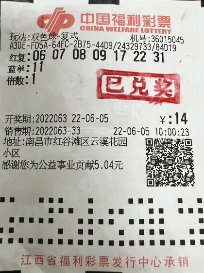 6月5日,南昌市红谷滩区云溪花园小区36015045号投注站传出喜讯,一张14元的7+1复式票,幸运中得当期双色球一等奖,获得累计奖金543万多元。6月8日,该大奖得主李大爷(化姓)在家人的陪同下,来到江西省福彩中心兑奖。