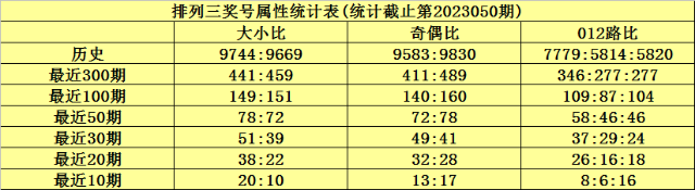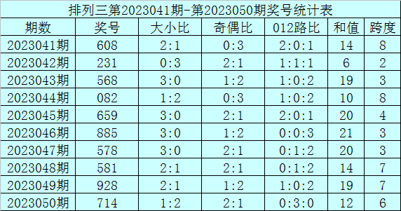 上期回顾:排列三第2023050期奖号为714,奖号012路比为0:3:0,奇偶比为2:1,大小比为1:2,和值为12,跨度为6。