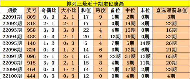 开奖回顾:排列三第2022100期奖号:444,定位直选遗漏值0期、4期、0期,遗漏总值为4期。
