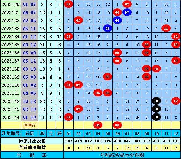 后区分析【一区01-04,二区05-08,三区09-12】:上期后区奖号为01和10,分别落在第一、三区,近50期后区三区比为32:30:38,近10期三区比为5:4:11,本期注意第一、二区号码出现,关注两码04+06。