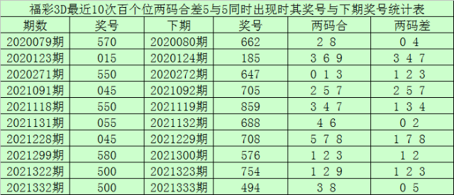百个位合差分析:上期奖号百个位开出50组合,两码合为5,两码差为5,最近10次百个位两码合5与两码差5同时出现时,其奖号和下期奖号分别为: