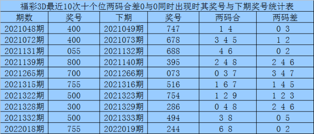 十个位合差分析:上期奖号十个位开出00组合,两码合为0,两码差为0,最近10次十个位两码合0与两码差0同时出现时,其奖号和下期奖号分别为:
