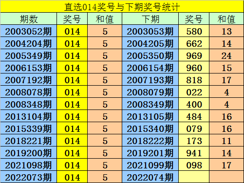 第2022073期3D奖号为:014,历史上该号码直选开出13次,下期号码分别为:580、662、969、960、818、022、400、484、079、173、941、098。