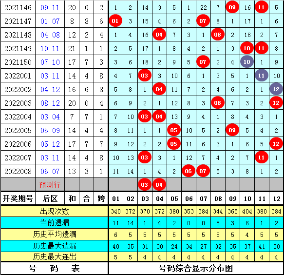 7、在第009期历史同期开奖中,后区奖号跨度分别开出:3-3-3-8-5-1-7-1-4-10-1-1-6-4-7,跨度范围在1-10之间,本期后区跨度参考1。