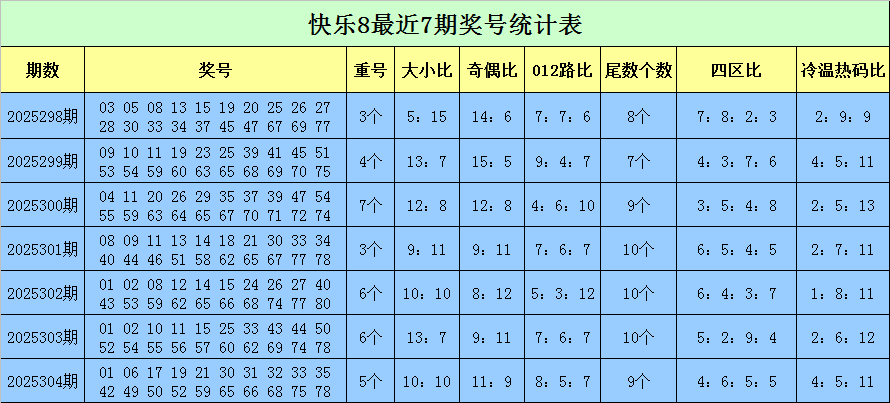 福彩快乐8第2025304期开出奖号:01 06 17 19 21 30 31 32 33 35 42 49 50 52 59 65 66 68 75 78,其中奖号奇偶比为11:9,大小比为10:10,012路比为8:5:7,四区比为4:6:5:5,包含5个重号01、33、50、52、78。