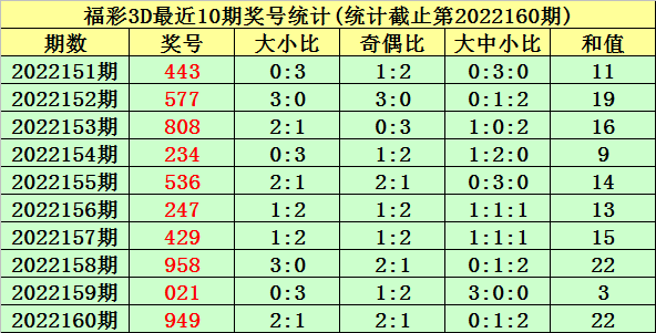 开奖回顾:福彩3D第2022160期奖号为:949。奖号类型为组三,和值为22,奇偶比为2:1,跨度为5,012路比为2:1:0,大小比为2:1。