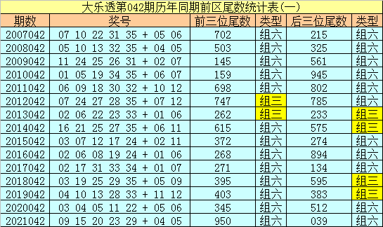 在大乐透第042期历年同期奖号中,前区前三位尾数出号频次分别为:尾数5出现7个,尾数2出现6个,尾数3、7出现5个,尾数0、1、4、6、9出现4个,尾数8出现2个。其中尾数数字三类型豹子、组三、组六次数比为0:2:13,今年同期前三位尾数类型参考组六;