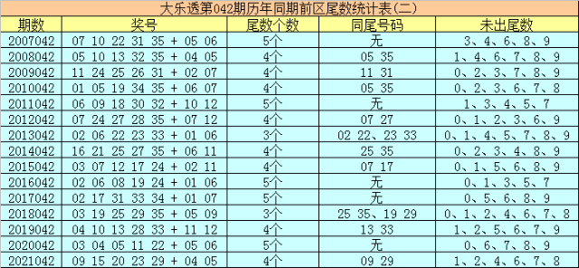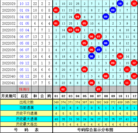 大乐透历年同期第042期后区尾数奇偶比为16:14,最近5年尾数奇偶比为7:3,后区尾数大小比为16:14,最近5年尾数大小比为6:4,本期后区注意号码01、02、07、10、11,后区两码关注02、07。