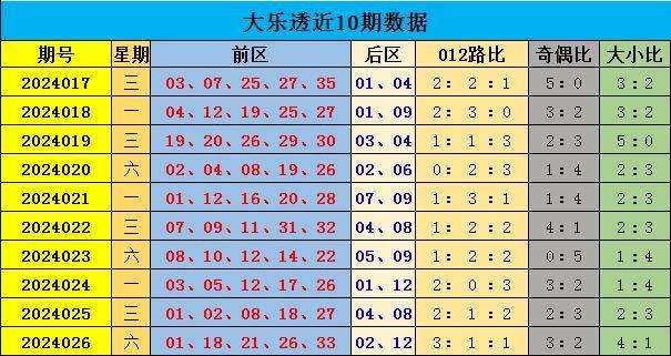 大乐透第2024026期开奖。当期开奖号码为:前区01 18 21 26 33,后区02 12。当期前区号码012路比3:1:1,奇偶比为3:2,大小比为4:1。