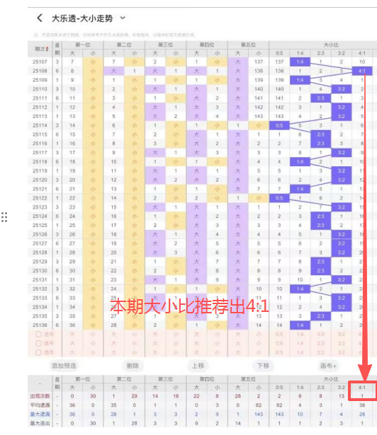 6、大小比:上期开出大小比为1:4,近93期开出4:1出现19次。3:2出现38次,2:3出现39次,1:4出现24次,5:0出现3次,本期推荐出4:1。