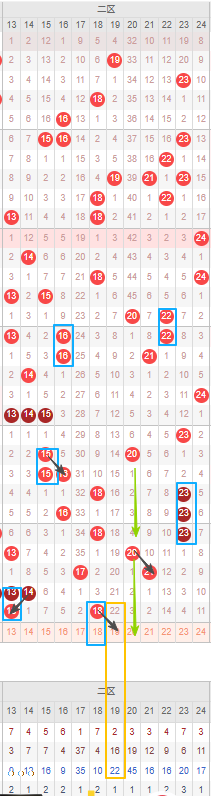 大乐透红球二区上期开出一奇一偶13、18号,且已经连续九期开出两个号说明二区持续走温,可以防冷号开出。