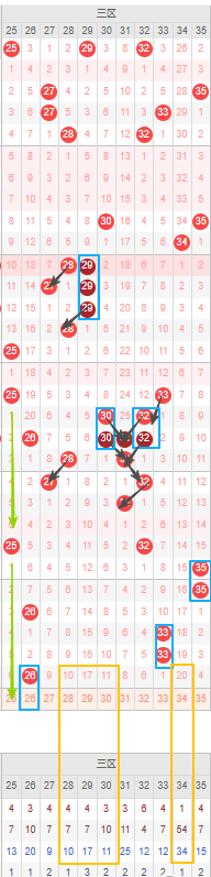 二区选号首先关注冷号29号、34号,目前已分别遗漏17、20期,并且达到自身最大遗漏期数,可以防大冷号开出;第二位建议关注30号,目前已遗漏10期达到自身最大遗漏期数,可以防冷号开出。