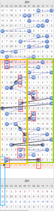 在近20期开出了9次重号,说明篮球区开出重号的概率较大,可以考虑02、09号防重号开出。