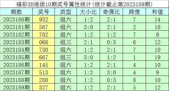 开奖回顾:福彩3D第2023189期奖号为327。奖号形态为组六,大小形态为小小大,奇偶形态为奇偶奇,和值为12,跨度为5。