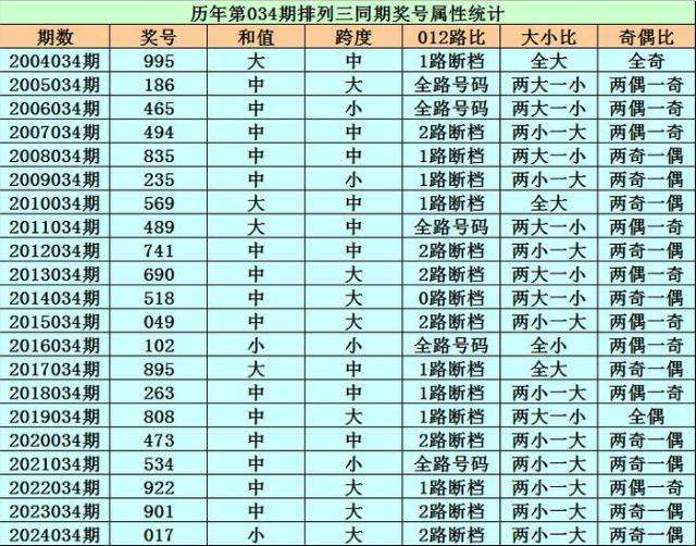 历史上第2025034期排列三已开出21期奖号了,历年同期奖号分别为:995、186、465、494、835、235、569、489、741、690、518、049、102、895、263、808、473、534、922、901、017,详细统计见下表: