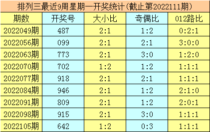 三、体彩排列三前9周星期一奖号分别开出:487-099-773-702-918-946-809-915-642,其中号码012路比为12:9:6,奇偶比为14:13,大小比为16:11;