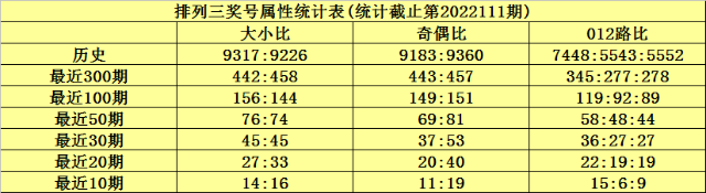 一、排列三第2022111期开出号码956,其奇偶比为2:1,大小比为3:0,号码012路比为2:0:1。该号码直选历史上出现了11次。