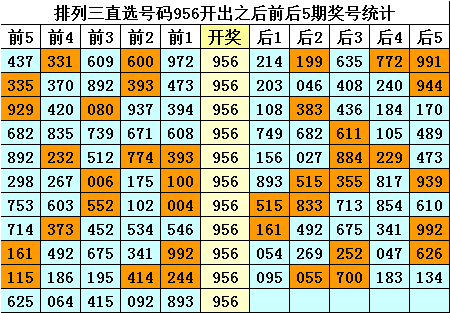 四、排列三直选号码956历史上开出11次,其前后五期奖号分别为: