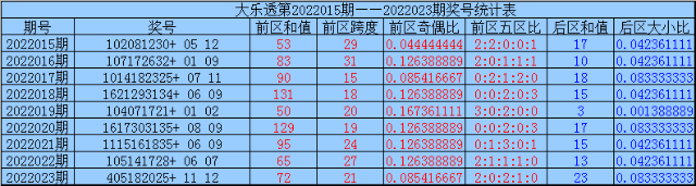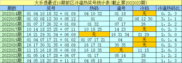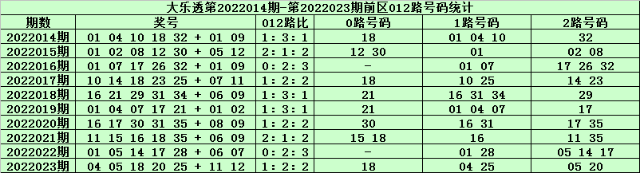 大乐透第2022023期开奖,前区:04、05、18、20、25;后区:11、12。其中前区012路比为1:2:2,奇偶比为2:3,和值为72,跨度为21,后区开出2路+0路号码。