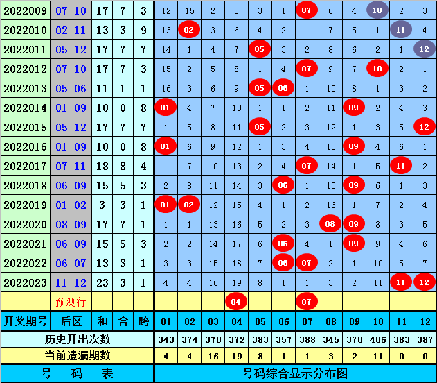 后区分析:上期后区开出奖号11和12,在最近50期开奖中,后区奖号012路落号比为37:27:36,前10期后区012路落号比为10:5:5,本期后区关注号码01、03、04、05、07,两码参考04、07。