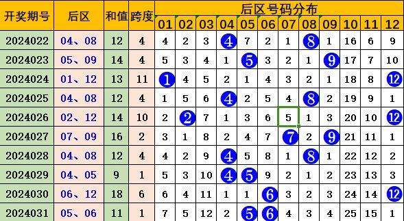 后区开出号码05、06,和值11,近10期和值都在9-18之间,预计下期和值出现在15-20。
