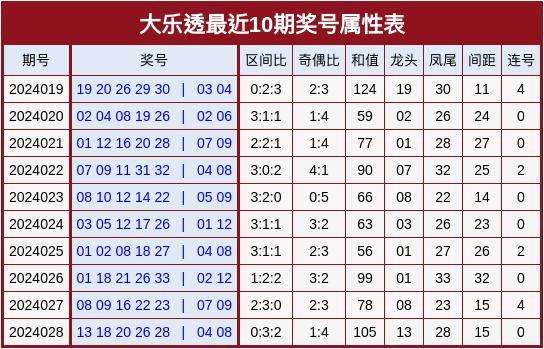 开奖回顾:第24028期大乐透奖号为13 18 20 26 28 + 04、08。区间比:0:3:2,奇偶比:1:4,首尾间距:15。