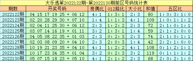上期回顾:大乐透第2022130期奖号为:05 07 15 18 23 + 05 10,其中前区奇偶比4:1,012路比2:1:2,大小比2:3,和值68,五区比2:0:2:1:0。