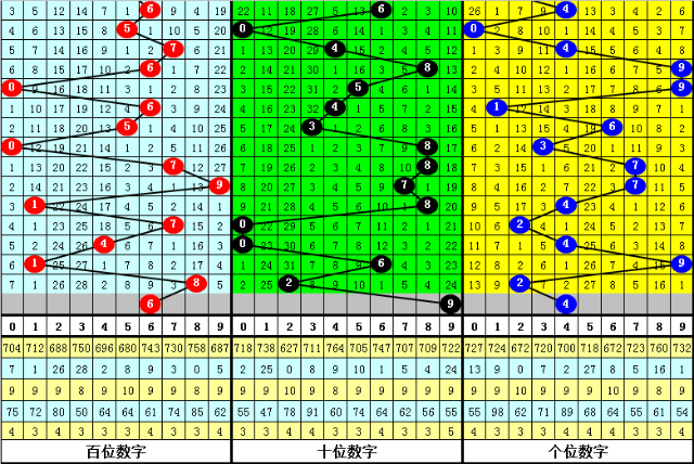 百位号码:第22041期-22045期奖号为:1-7-4-1-8,振幅为7点,分布较分散,本期看好百位走低,注意号码6。