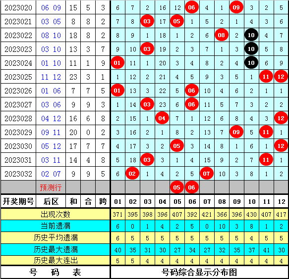后区上期开出奖号:02+07,前6次后区奖号02+07出现之后,其下期分别开出号码:06+11、05+11、01+06、02+08、03+12、02+09,本期后区注意五码01 05 06 12,单挑两码05 06。