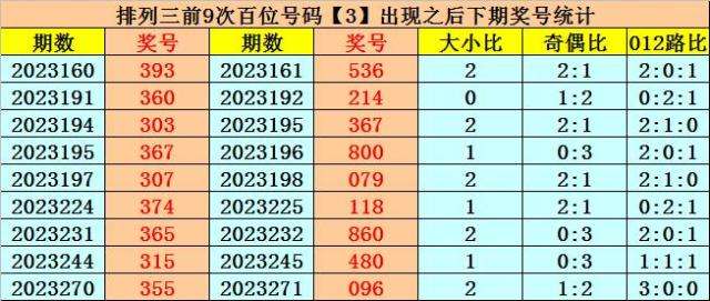 在百位前9次出现号码3之后,下期百位分别开出奖号:5-2-3-8-0-1-8-4-0,其中开出号码个数奇偶比是3:6,大小比是3:6,012路比是3:2:4。