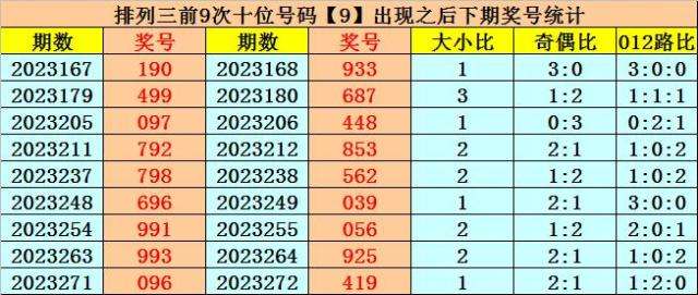 在十位前9次出现号码9后,其下期奖号分别开出:3-8-4-5-6-3-5-2-1,其中奖号个数012路比是3:2:4,奇偶比是5:4,大小比是4:5。