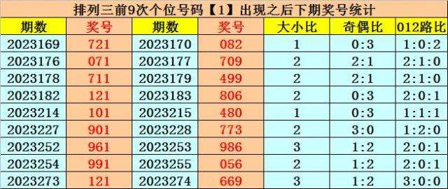 个位前9次开出号码1时,该位下期奖号分别为:2-9-9-6-0-3-6-6-9,其中号码个数大小比是6:3,012路比是8:0:1,奇偶比是4:5。