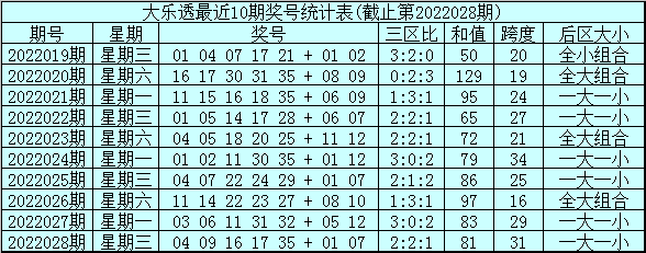 大乐透第2022028期奖号为,前区:04、09、16、17、35;后区:01、07。其中前区奖号三区比为2:2:1,和值为81,跨度为31,后区开出一大一小组合。