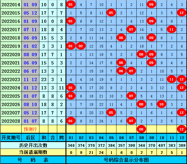 后区分析:上期后区两码开出01+07,为一大一小组合,近50期后区全大组合出现12次,全小组合出现9次,一大一小组合出现29次,,近10期后区全大组合出现3次,全小组合出现1次,一大一小组合出现6次,本期后区关注全大组合,参考两码08、12。