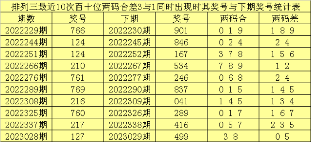 百十位合差分析:上期奖号百十位开出67组合,两码合为3,两码差为1,最近10次百十位两码合3与两码差1同时出现时,其奖号和下期奖号分别为: