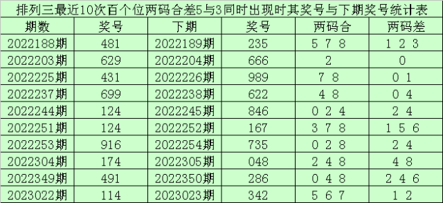 百个位合差分析:上期奖号百个位开出69组合,两码合为5,两码差为3,最近10次百个位两码合5与两码差3同时出现时,其奖号和下期奖号分别为: