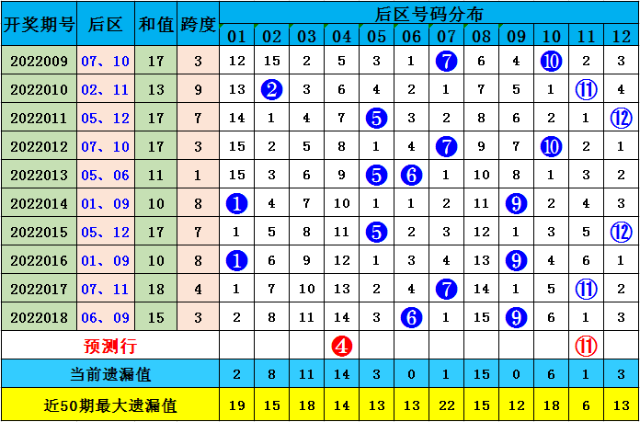 后区奖号分析:上期后区奖号为06和09,在近10期奖号中,后区奖号频次分别为:号码03、04、08出现0个,号码02出现1个,号码01、06、10、11、12出现2个,号码05、07、09出现3次,本期后区号码大范围参考:01、03、04、07、11,单挑一注:04 + 11。