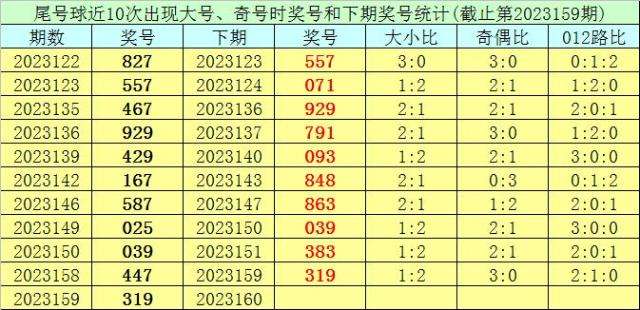 在尾号球前10次开出大号、奇号类型之后,其下期分别开出奖号:557、071、929、791、093、848、863、039、383、319,其中号码012路比为6:3:1,奇偶比为9:1,大小比为5:5。