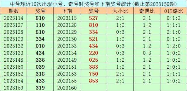 开奖回顾:体彩排列三第2023159期开出奖号319,奖号大小比开出1:2,奇偶比开出3:0,012路比开出2:1:0。