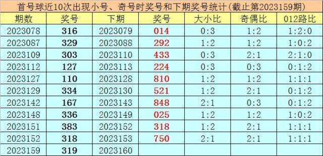 在首号球前10次开出小号、奇号类型之后,其下期分别开出奖号:014、292、433、224、810、521、848、025、318、750,其中号码012路比为3:2:5,奇偶比为3:7,大小比为4:6。