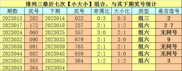 大小分析:排列三上期开出号码364,大小类型为【小大小】,最近七次开出大小类型小大小的奖号分别为:282、172、060、090、091、082、383,其下期分别开出号码:022、237、357、679、763、659、364。其中号码大小比为12:9,大小号码开出比例基本相等,本期预计小号转热,关注大小比1:2。