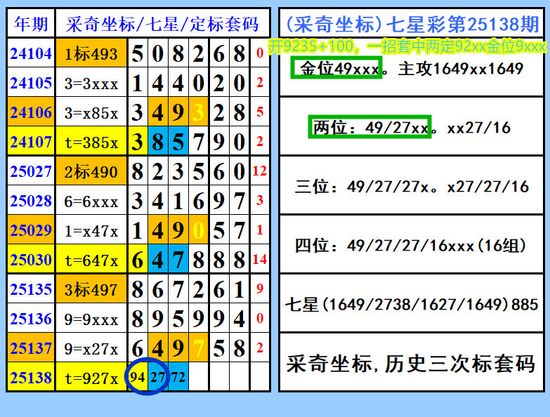 (采奇坐标)视频经典回顾,七星彩第138期,一招套中两定92xx金位9xxx