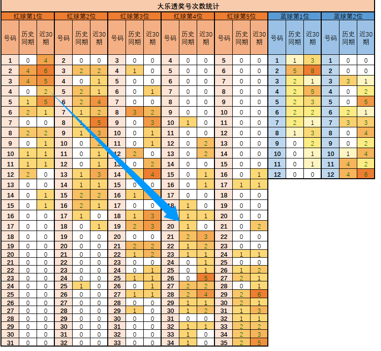 1、如上图,背景越深色,说明出号频率越高。