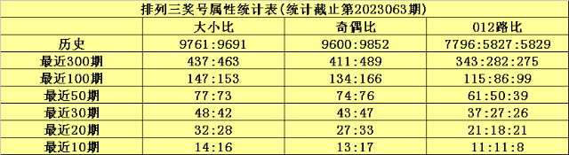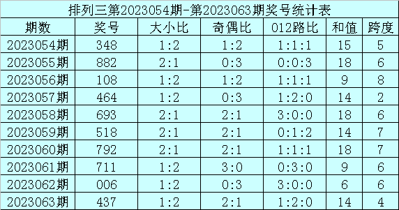 上期回顾:排列三第2023063期奖号为437,奖号012路比为1:2:0,奇偶比为2:1,大小比为1:2,和值为14,跨度为4。