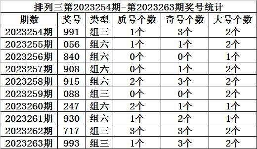 上期回顾:排列三第2023263期开奖:993,质合比为1:2,奇偶比为2:1,大小比为3:0。