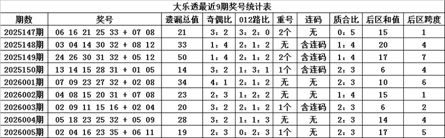 后区跨度:后区近9期跨度分别开出1-4-7-4-6-1-2-4-5,跨度奇偶比为4:5,上期跨度上升1个点位,本期看好跨度继续上升,预计开的偶数跨度,关注跨度8。