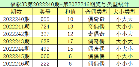 福彩3D第2022246期回顾:奖号为222,奖号奇偶比为0:3,大小比为0:3,和值为6,类型为豹子。
