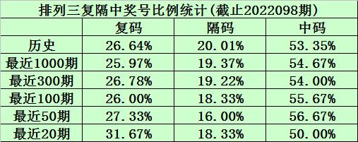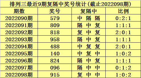 上期回顾:排列三第2022098期奖号为:915。大小比为2:1,奇偶比为3:0,012路比为1:1:1。
