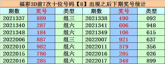 在十位开奖中,号码8前7次出现之后,下期奖号分别为:9、0、0、2、7、8、4,其中奖号奇偶比为2:5,大小比为3:4,012路比为3:2:2。